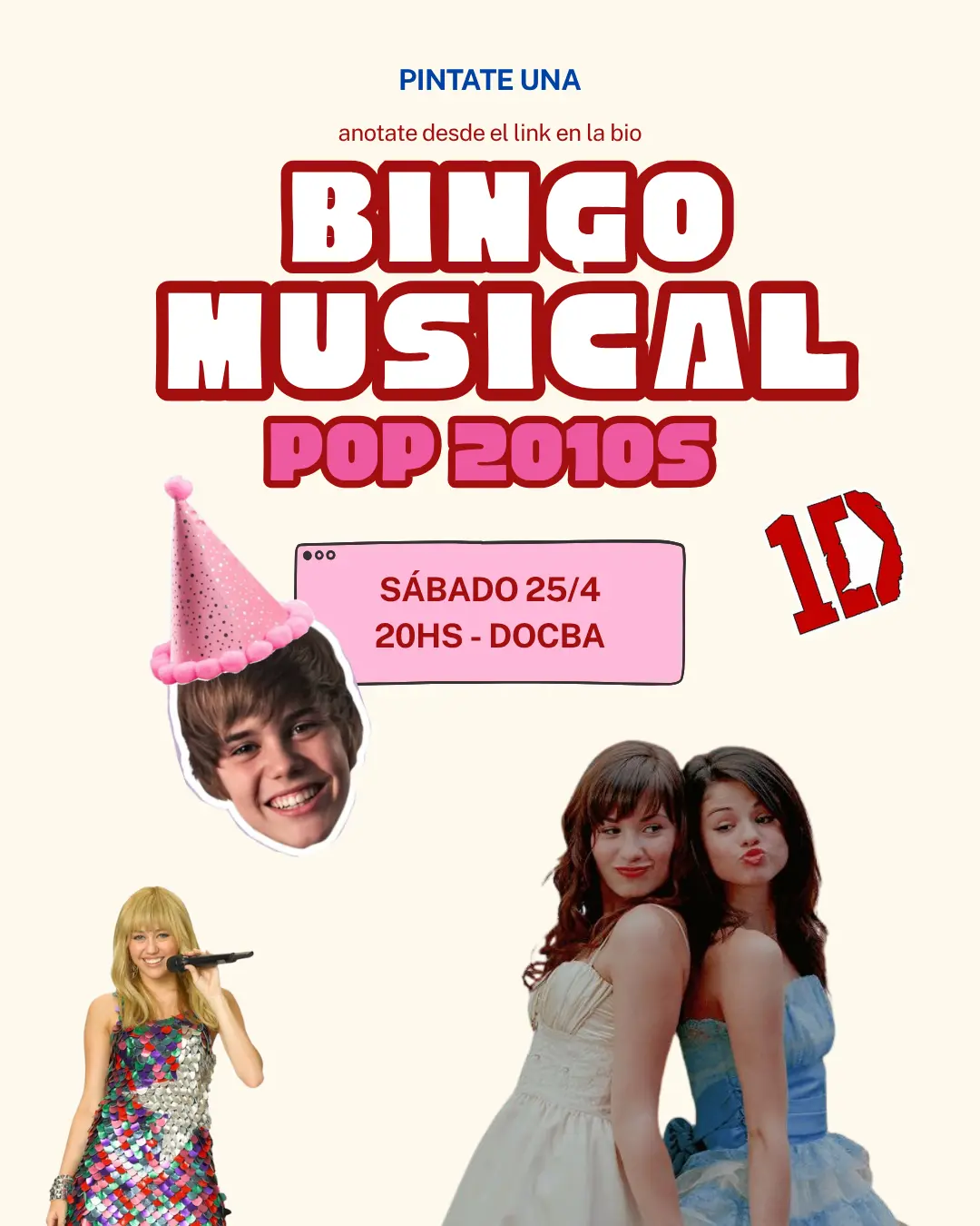 Vení a jugar al BINGO MUSICAL Pop 2010s, donde van a sonar los hits más icónicos de artistas como One Direction, Selena Gomez, Demi Lovato, Miley Cyrus, Justin Bieber, Ariana Grande y muchos más 🎤✨