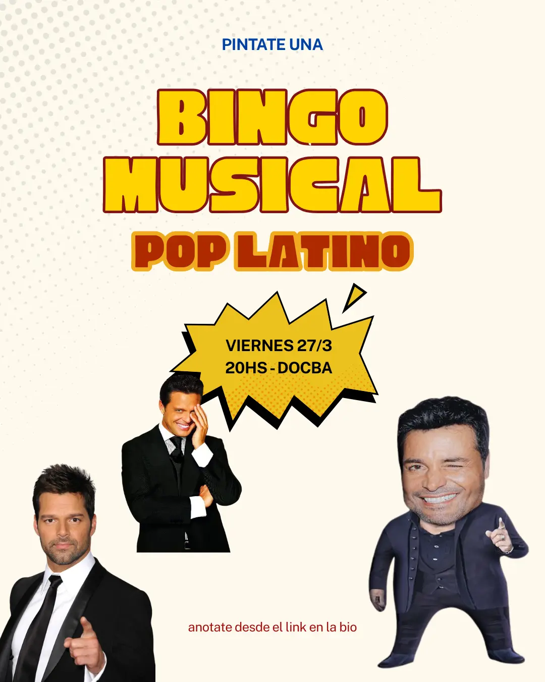 Vení a jugar al BINGO MUSICAL Pop Latino, donde van a sonar los hits más icónicos de artistas como Ricky Martin, Luis Miguel, Chayanne, Luis Fonsi, Shakira, Enrique Iglesias y muchos más 🎤✨
