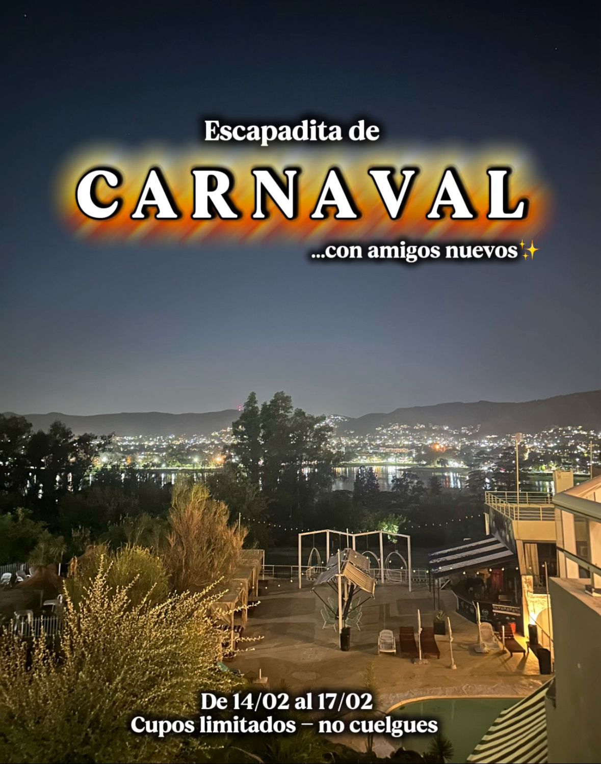 Del 14 al 17 de febrero de 2026 viví un Carnaval increíble 🎉 en un lugar espectacular, haciendo amigos nuevos y compartiendo momentos únicos. Disfrutá de meriendas en la pileta 🫖, salidas a cenar y bailar juntos 💃, desayuno buffet ☕, la Fiesta Summer en la piscina 🌞🏖, cenas con show en vivo 🎶 y una excursión relax al río de las sierras 🌿🌊. El último día decidimos juntos la cena libre y cerramos con un último desayuno fabuloso para despedir esta experiencia