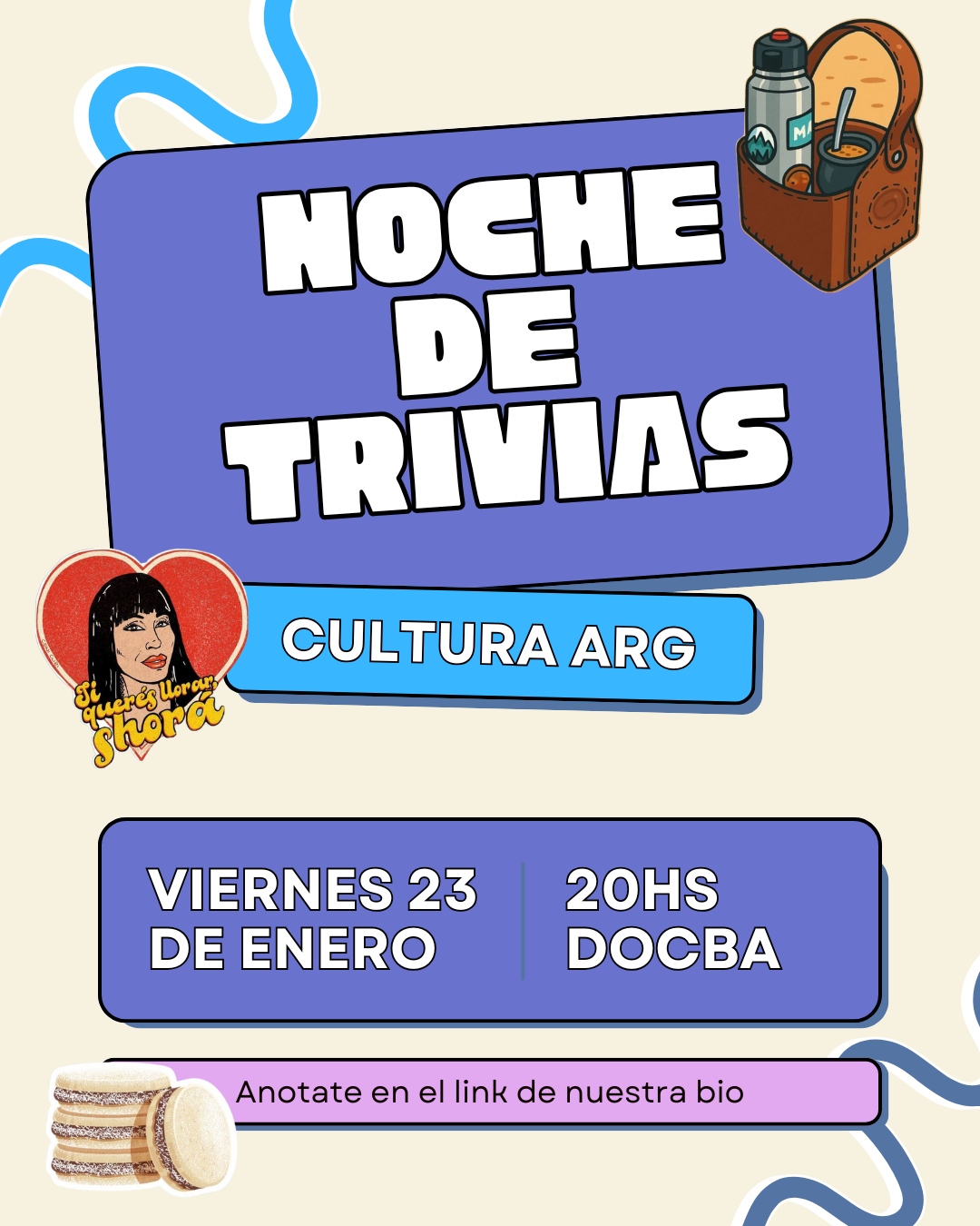 A lo largo de la noche van a jugar distintas rondas de preguntas de cultura general argentina, mezclando costumbres, historia liviana, música, tele, frases y datos que todas conocemos. Las respuestas se piensan en equipo, se escriben y se puntúan ronda a ronda, en un clima relajado, divertido y participativo.