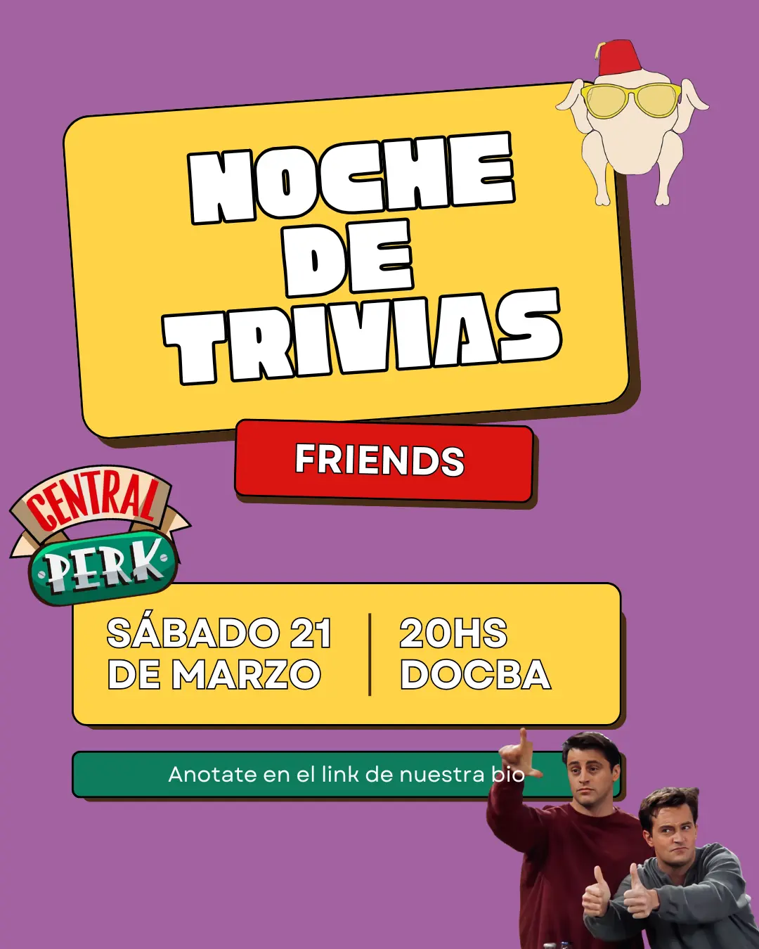 Durante la noche van a jugar distintas rondas de preguntas sobre el universo Friends: capítulos icónicos, frases, personajes, romances, momentos inolvidables y detalles que solo los verdaderos fans recuerdan.